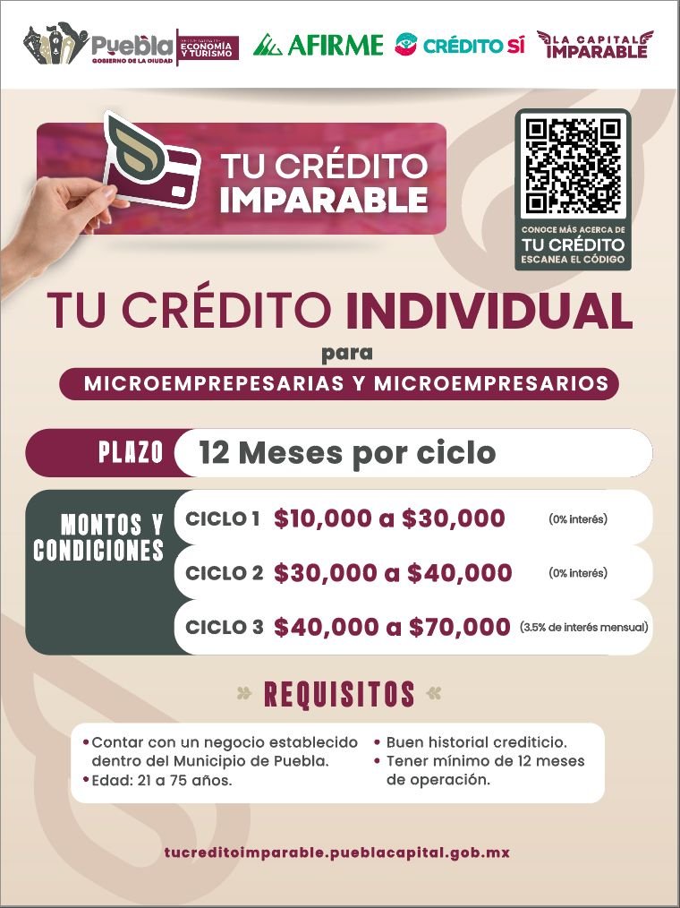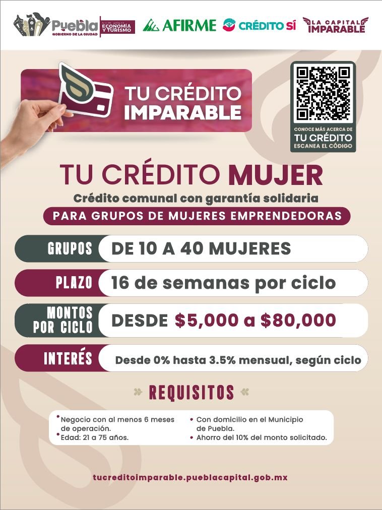 El programa contempla tres modalidades: Tu Crédito Mujer, Tu Crédito Individual y Tu Negocio Sí Plus, dirigidas a personas con proyectos productivos o negocios establecidos dentro del municipio de Puebla.